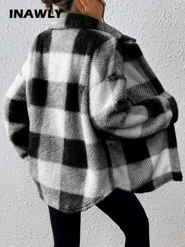 INAWLY Veste casual à carreaux et à poils longs pour femmes